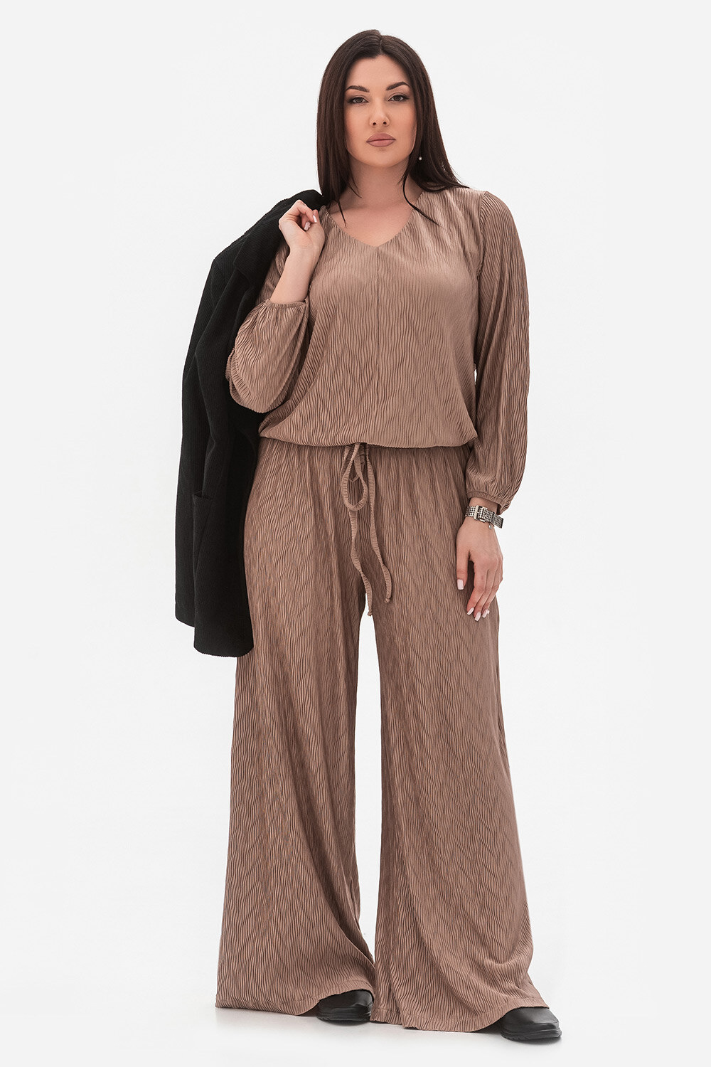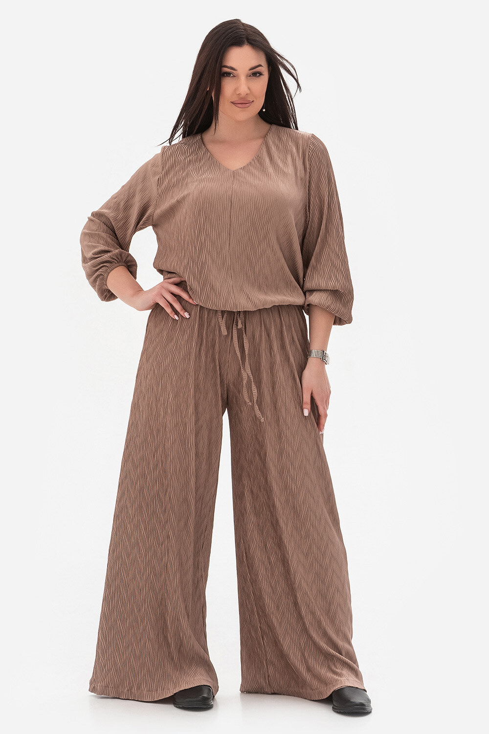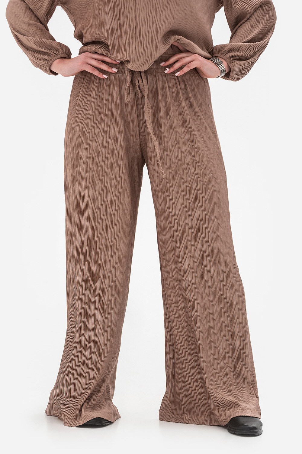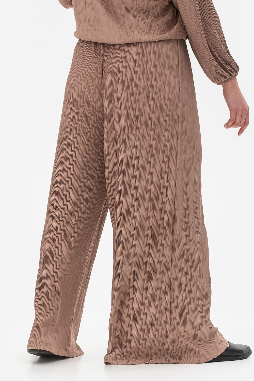 - Damskie spodnie z szerokimi nogawkami wykonane z teksturowanego materiału - połączenie stylu i wygody.