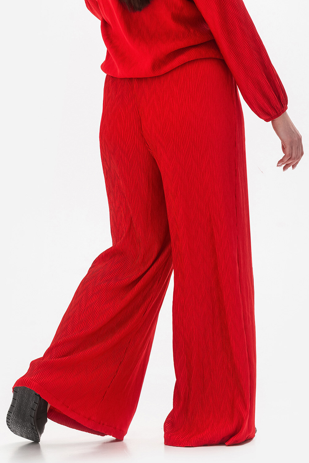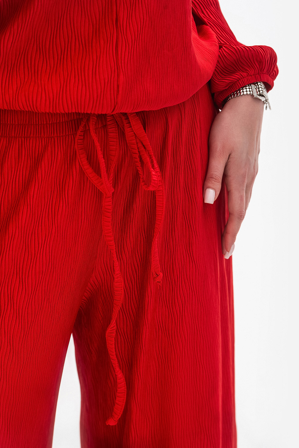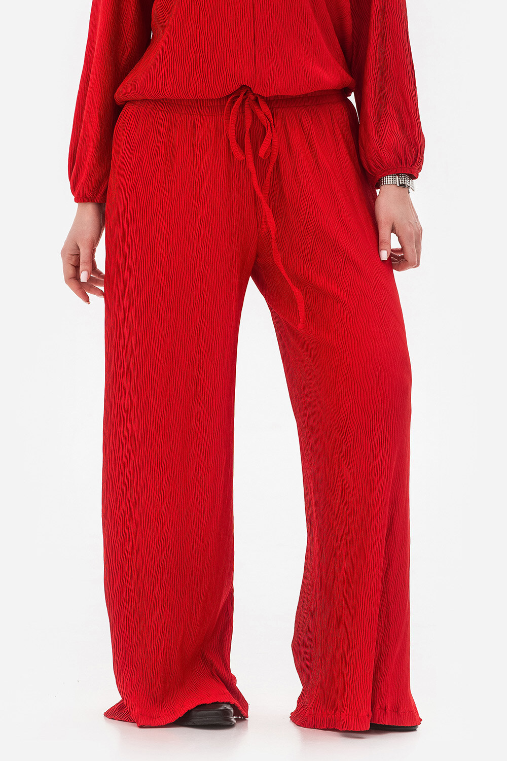 - Damskie spodnie z szerokimi nogawkami wykonane z teksturowanego materiału - połączenie stylu i wygody.