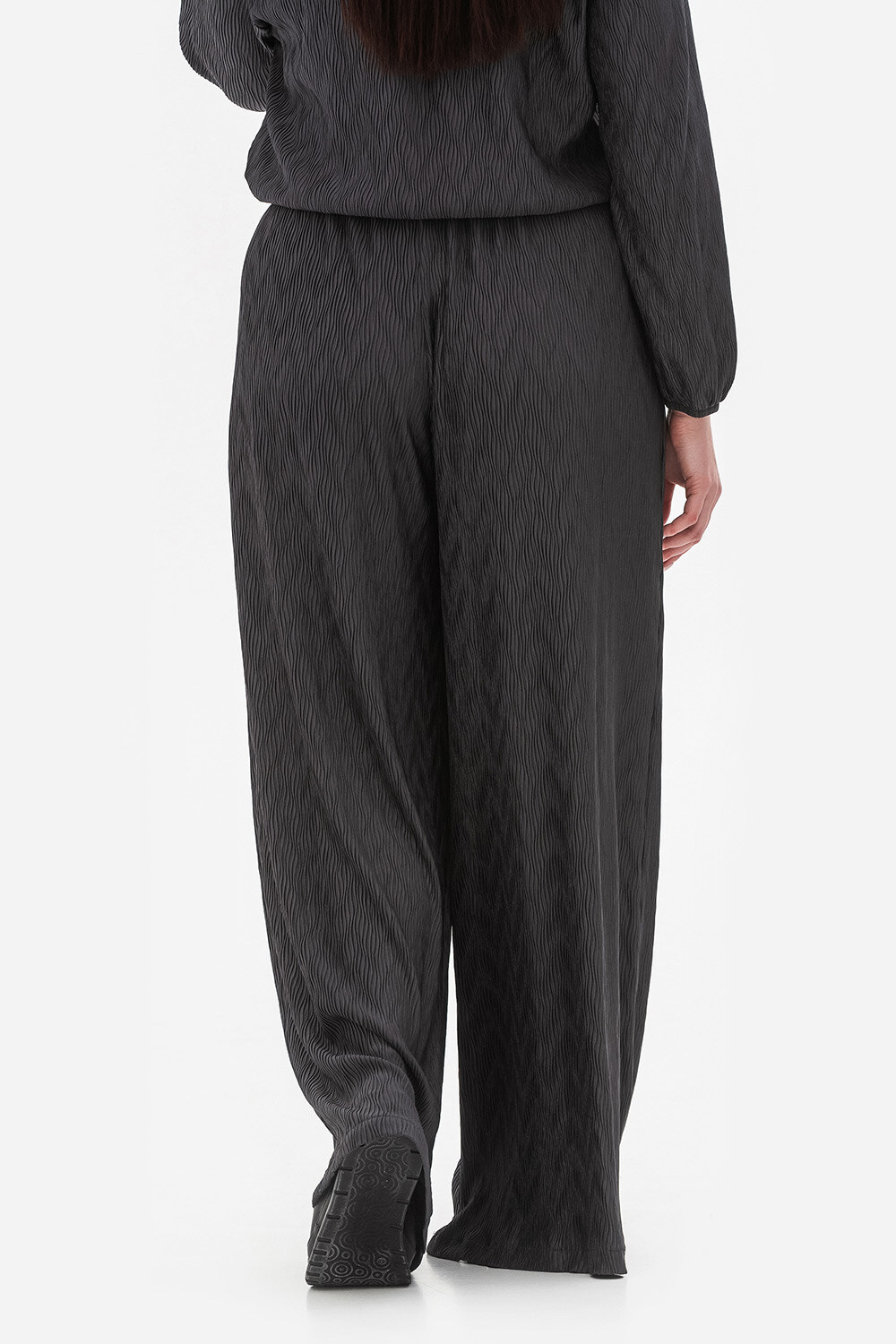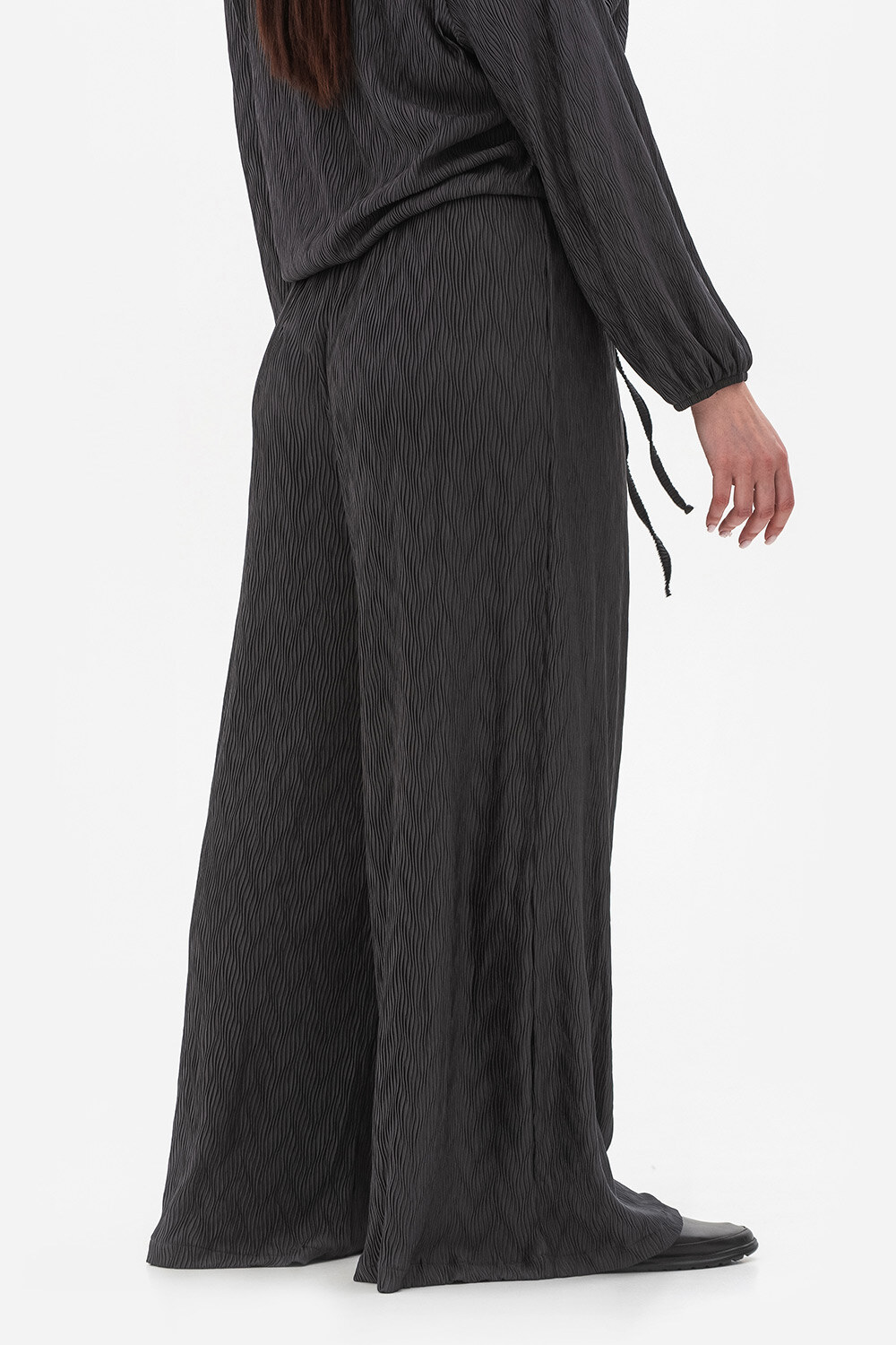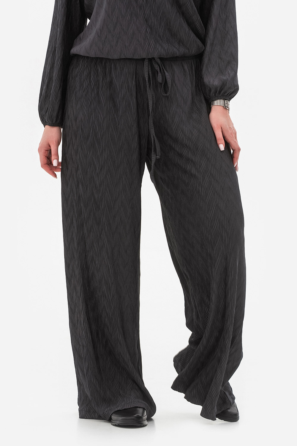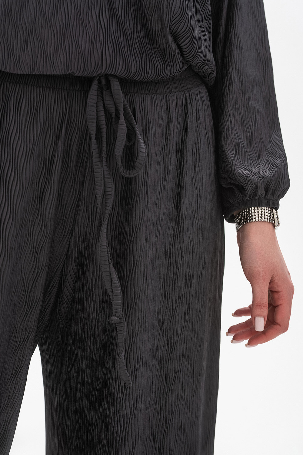 - Damskie spodnie z szerokimi nogawkami wykonane z teksturowanego materiału - połączenie stylu i wygody.