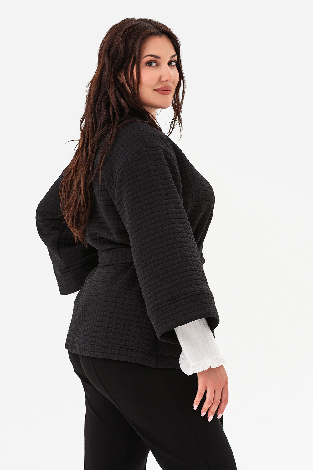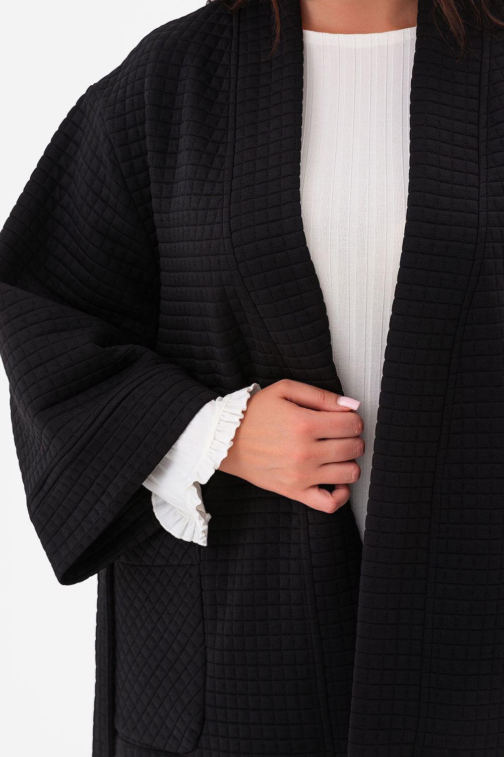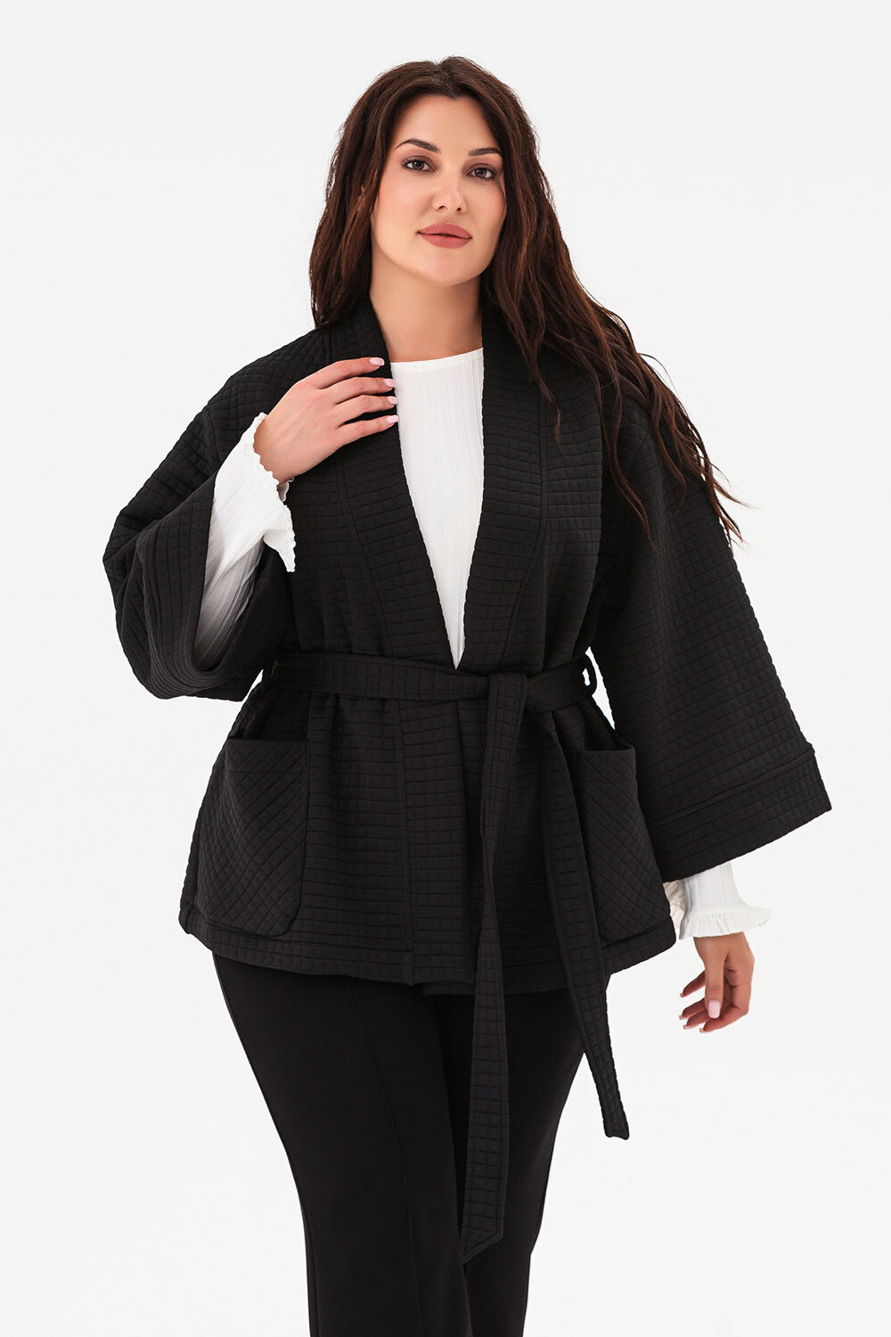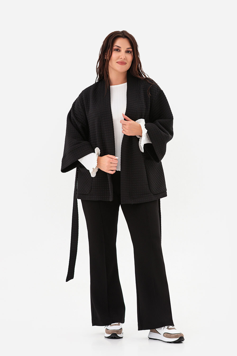 - Luźny kimonowy krój daje poczucie swobody i lekkości, tworząc efekt swobodnej elegancji.