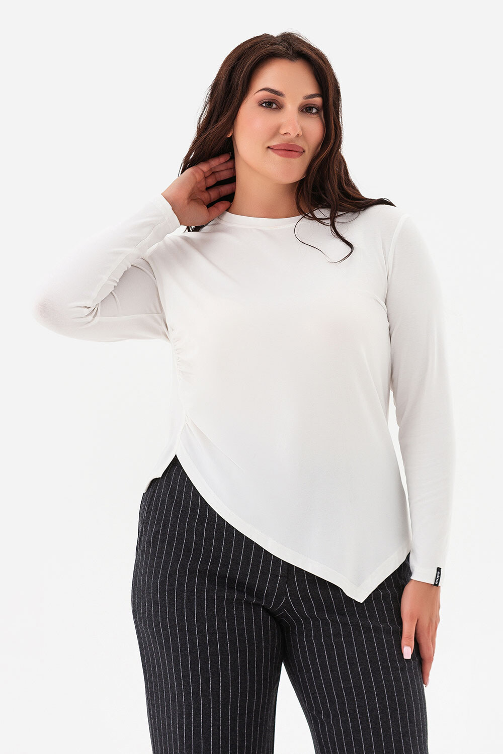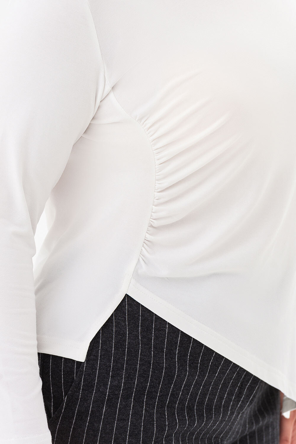 - Asymetryczny krój z przodu i lekkie drapowanie z boku talii tworzą delikatny efekt korygujący, nadając sylwetce elegancji i harmonii.