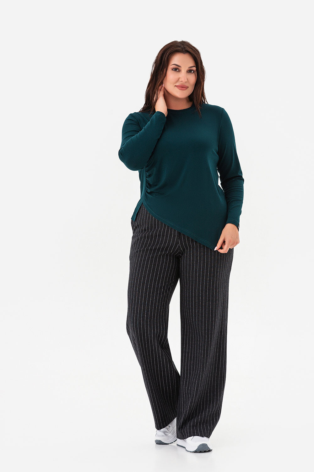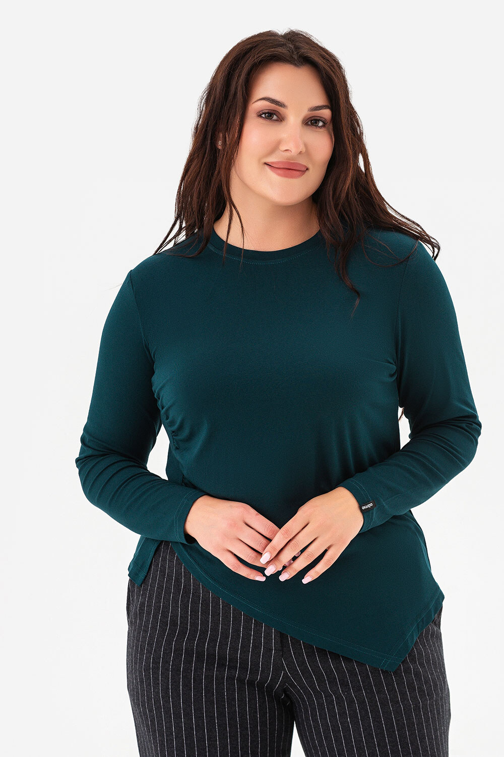 - Asymetryczny krój z przodu i lekkie drapowanie z boku talii tworzą delikatny efekt korygujący, nadając sylwetce elegancji i harmonii.
