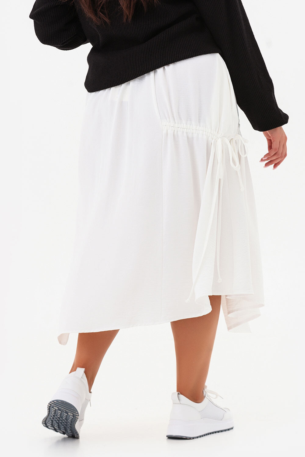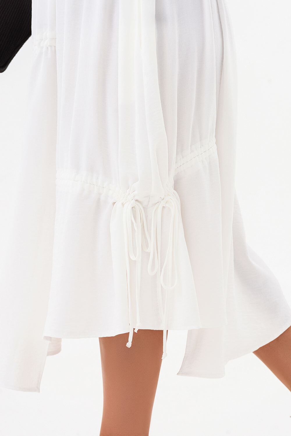 - Asymetryczne linie dodają architektonicznego i dynamicznego wyglądu, a wiązania pozwalają zmieniać sylwetkę w zależności od nastroju - od luźnej do obcisłej.