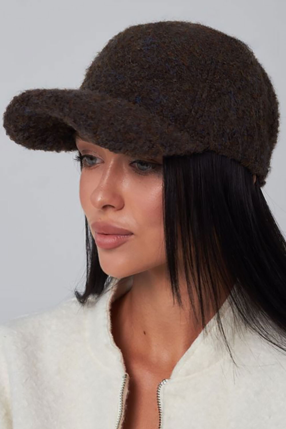 - Czapka z daszkiem wykonana z przędzy bouclé o ciekawej zapętlonej fakturze stylowo ozdobi zimową stylizację.
