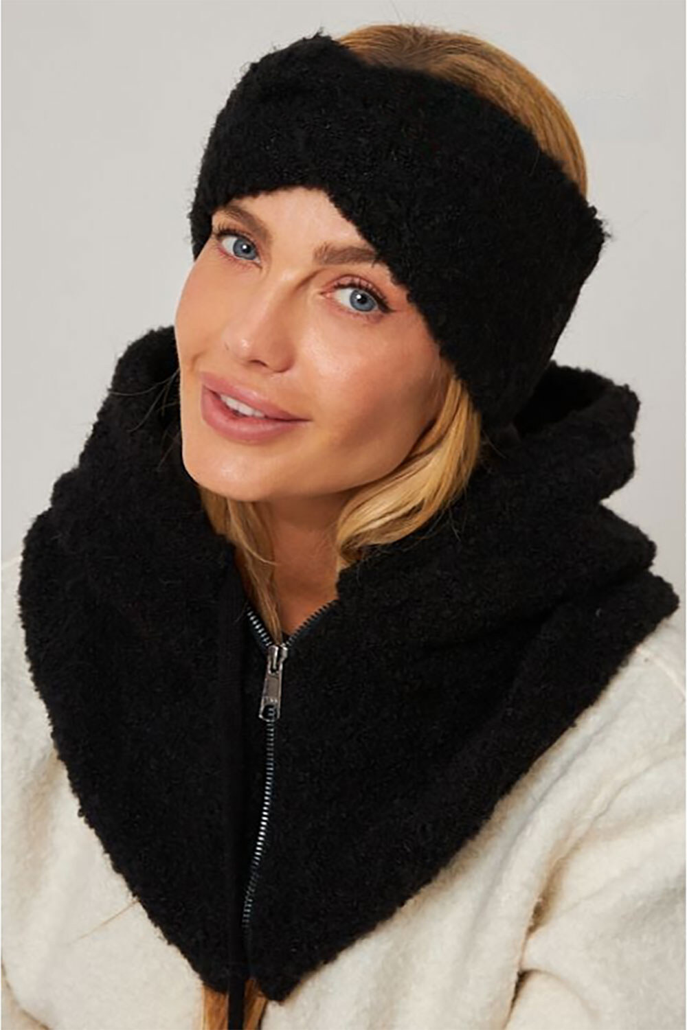 - Model wykonany z materiału bouclé z dużym reliefem złożonych i drobno wzorzystych pętli - miękki, gęsty, bardzo ciepły i dodatkowo ocieplony polarem w środku.